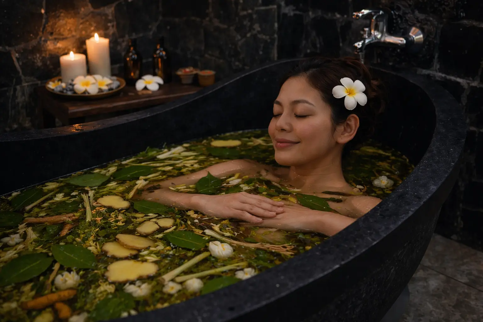 Immerse yourself in a warm herbal bath i...